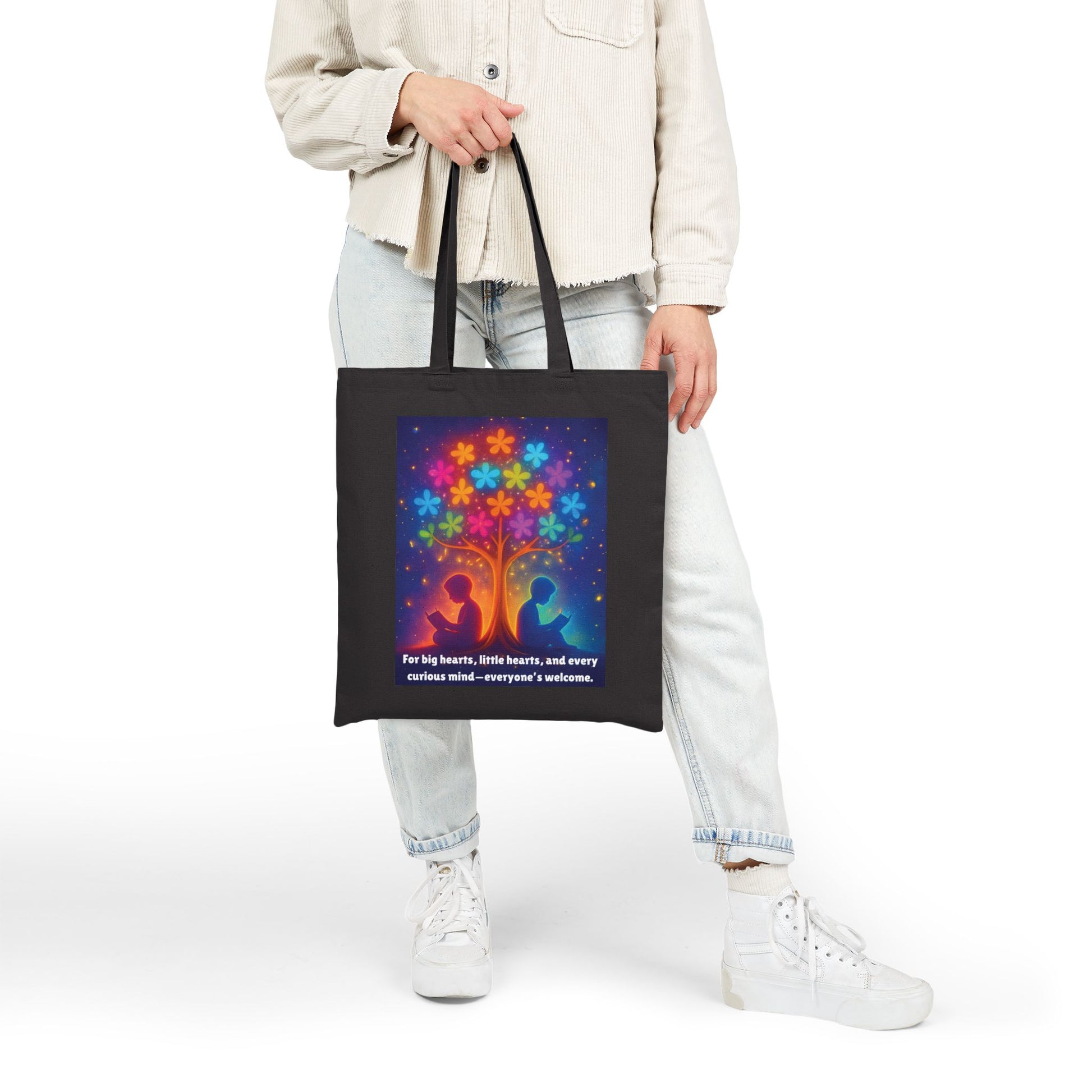 Carry a little wonder with you wherever the day leads. The Colorful Tree of Wonder cotton canvas tote is designed for big hearts, little hearts, and anyone who believes curiosity should always feel welcome. Featuring a luminous, childlike illustration of a glowing tree filled with multicolored blossoms and a small figure reading beneath its branches, this tote feels like a quiet reminder that imagination and kindness belong everywhere.