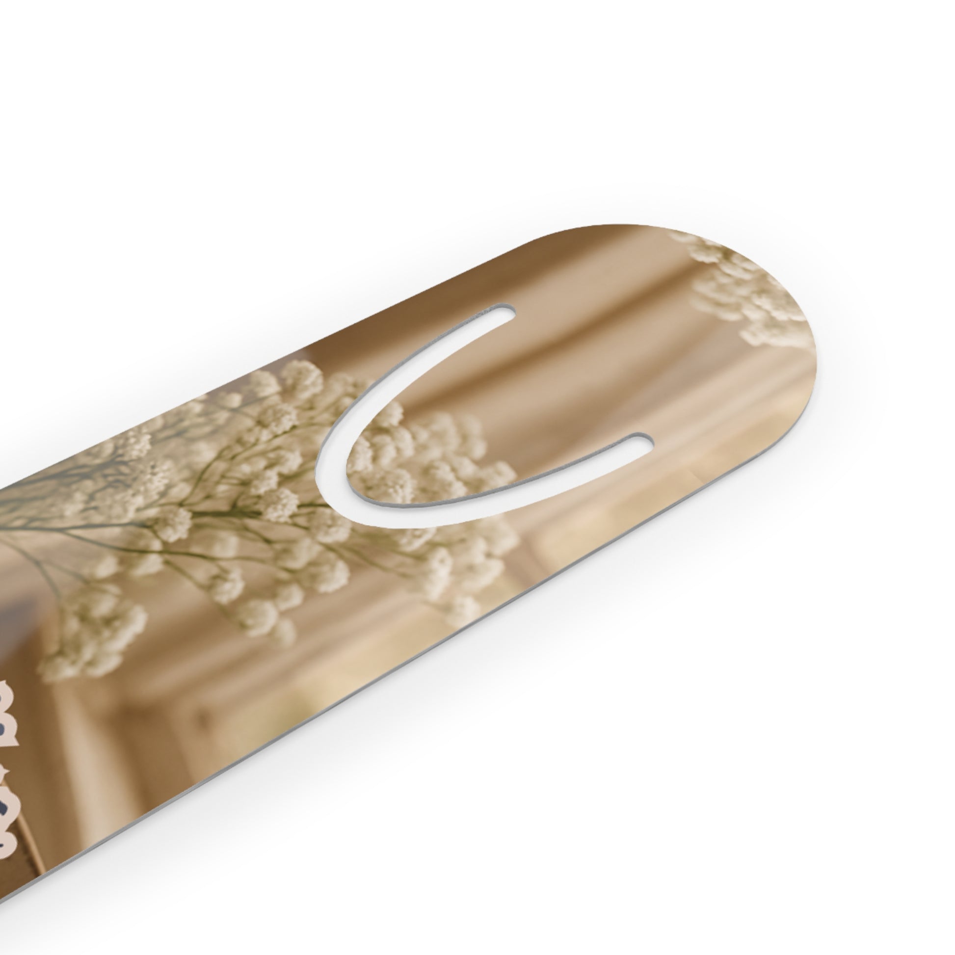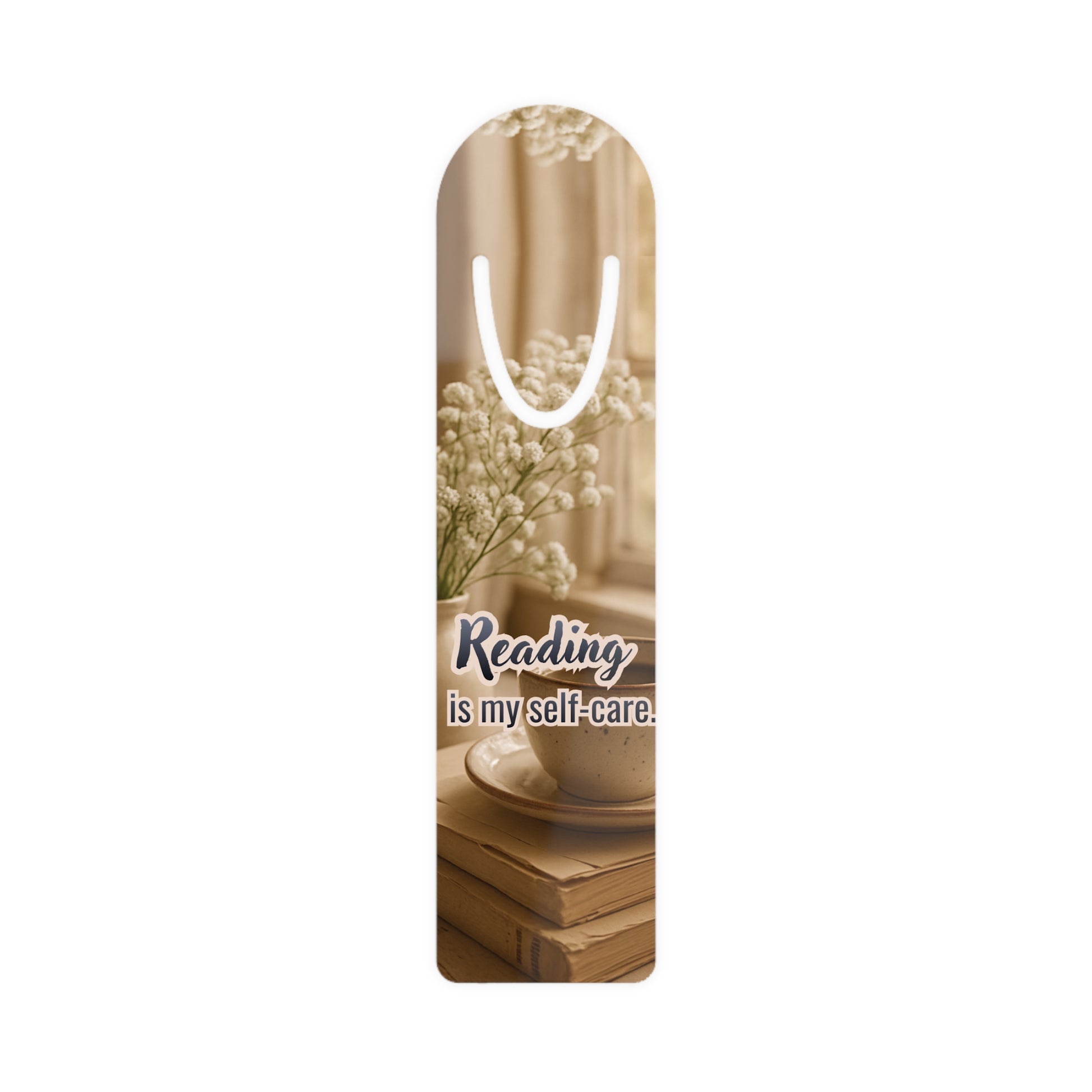 A slim, elegant aluminum bookmark that turns quiet reading moments into gentle self-care rituals. The front features a soft, sepia-toned design of stacked books, a steaming cup, and delicate baby's breath blooms, with the comforting line “Reading is my self-care.” The rounded top and lightweight metal body slip easily between pages and the curved slot at the top secures your place without damaging paper. Built from a brushed aluminum base with a bright white printable face, the bookmark gives vivid, crisp color reproduction that keeps your favorite artwork vibrant. Assembled in the USA from globally sourced parts, this bookmark blends durability with a calming aesthetic and a small piece of ceremony you can carry between chapters.
